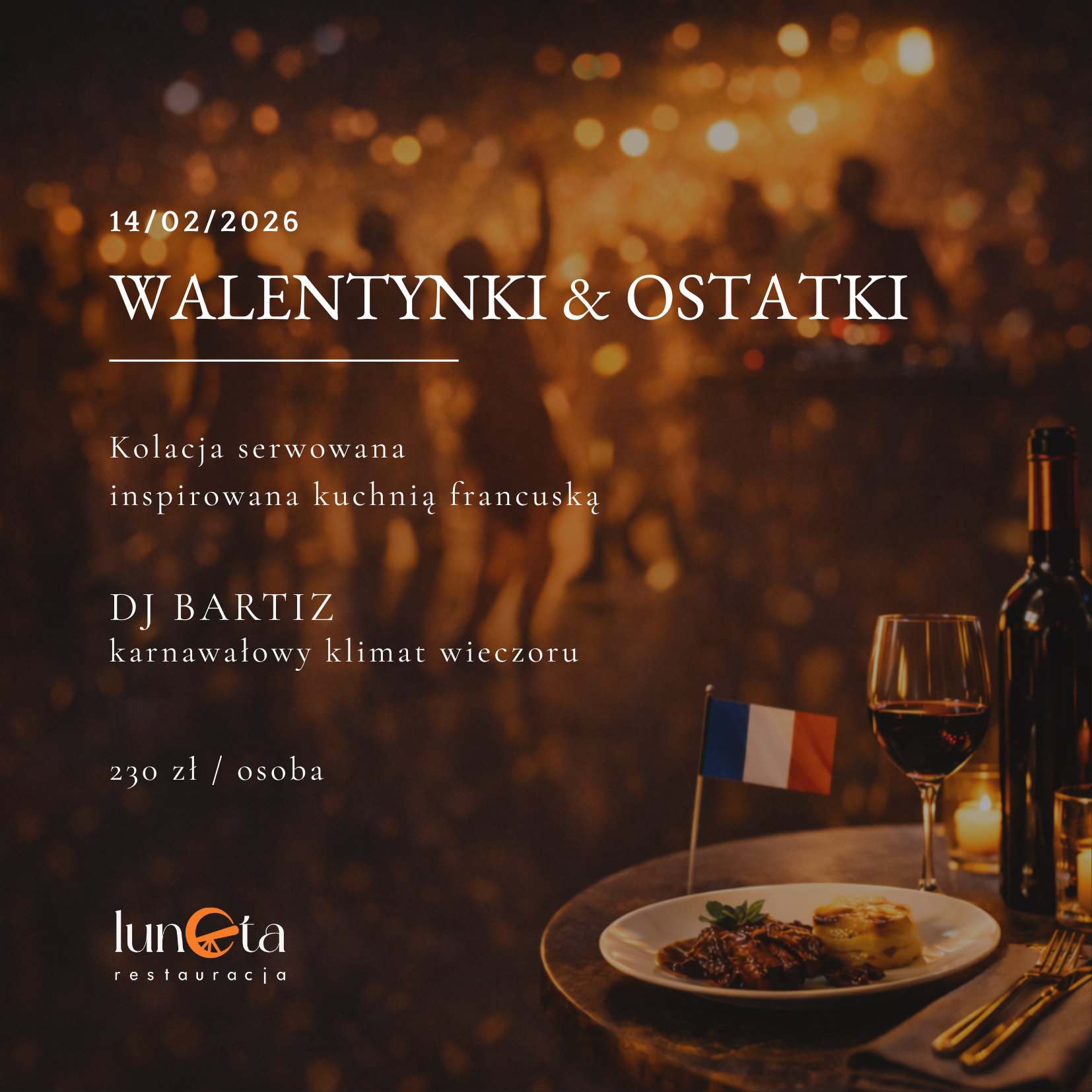 14 lutego 2026 roku Restauracja Luneta w Zamościu zaprasza na wyjątkowy wieczór łączący kolację serwowaną inspirowaną kuchnią francuską z karnawałową zabawą taneczną z DJ-em. Wydarzenie zostało zaplanowane w formule kolacyjno-tanecznej, która pozwala połączyć spokojną, restauracyjną kolację z dalszą częścią wieczoru w tanecznej atmosferze.